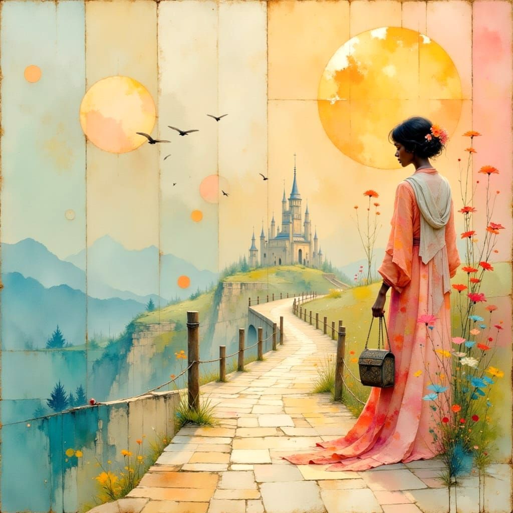 This image shows a hyperrealistic watercolor dreamscape blending sunrise and sunset. It features serene and busy elements, ancient towns, vintage cars, and a Klimt-inspired woman in soft pastel colors, with art deco and art nouveau influences.