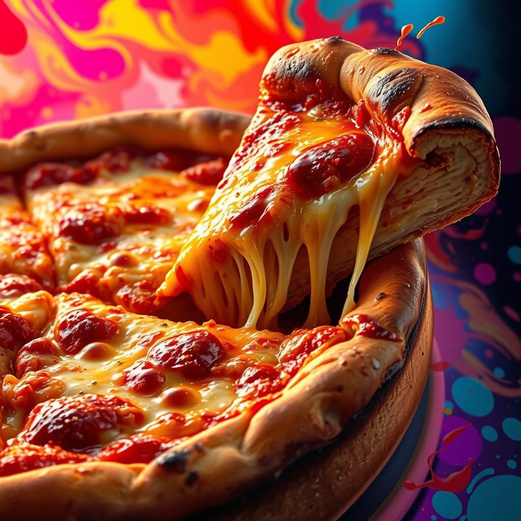 A close-up image of a Chicago deep-dish pizza with a golden crust and melted cheese, presented as vibrant splash art. The composition and lighting highlight the intricate details.