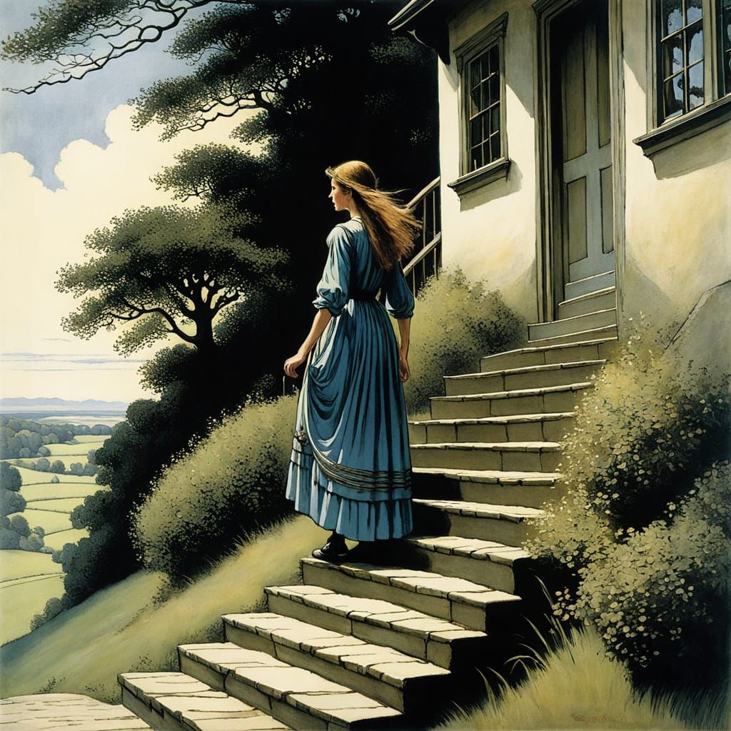 This image shows a woman looking out from the top of a grand staircase, surrounded by vibrant colors reminiscent of Arthur Rackham's style, with intricate details inspired by the works of Quint Buchholz.