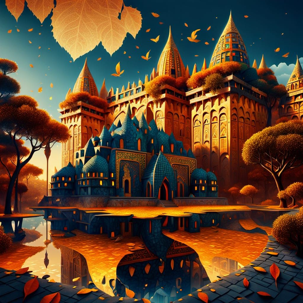 A vibrant cityscape with Egyptian and Gaudi architectural influences. Warm golden lighting enhances intricate mosaic details and orange-yellow leaves in this cinematic fantasy scene.