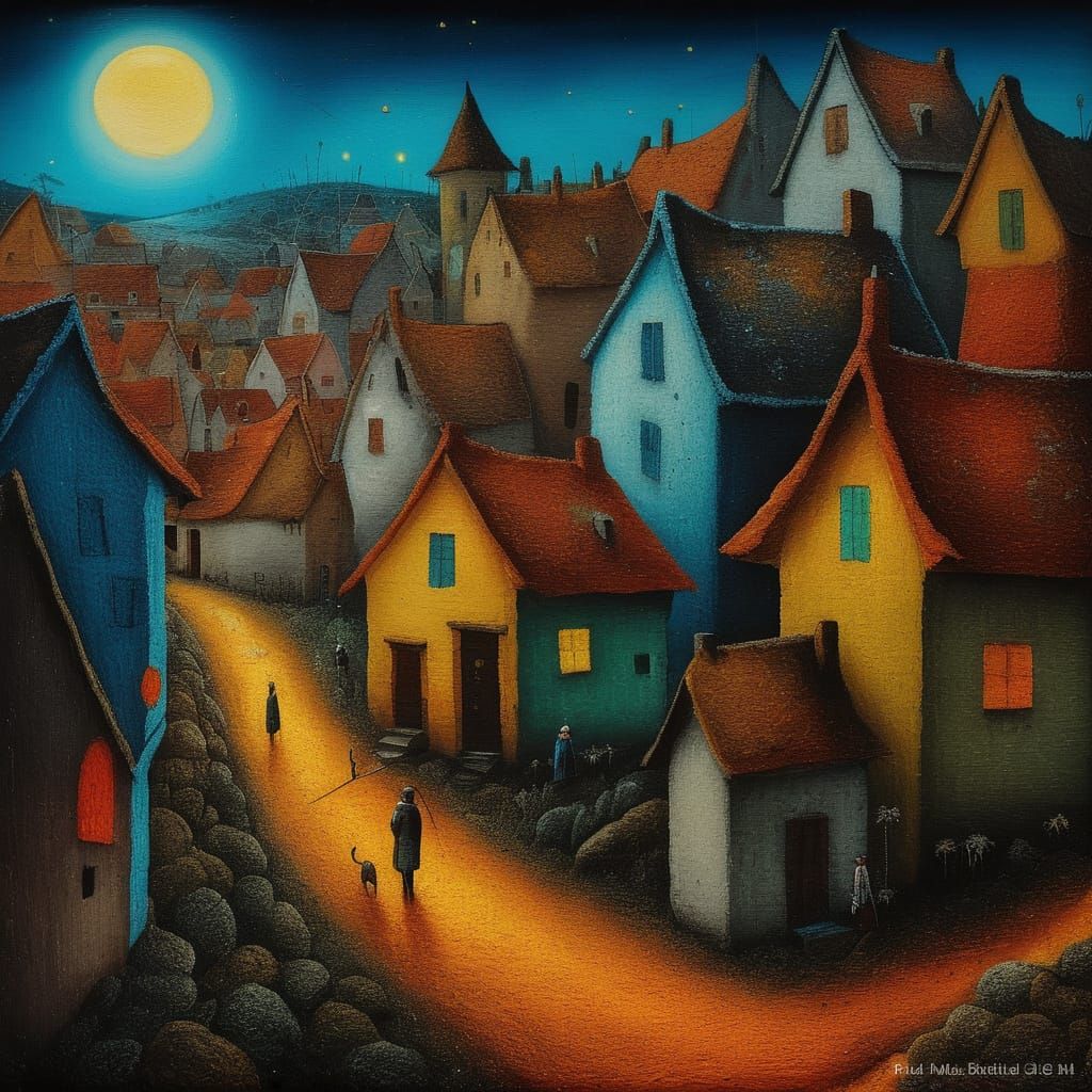 A vibrant acrylic painting of a Gaulish village illuminated by fireflies. The artwork features vivid colors and intricate details reminiscent of a Studio Ghibli animation, with a touch of surrealism.
