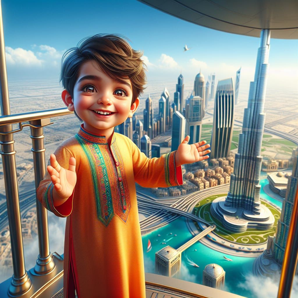 This image shows a cute South Asian boy in traditional clothing waving from a skyscraper observation deck. The Dubai cityscape and clear sky create a bright, happy, family-friendly scene as detailed matte painting.