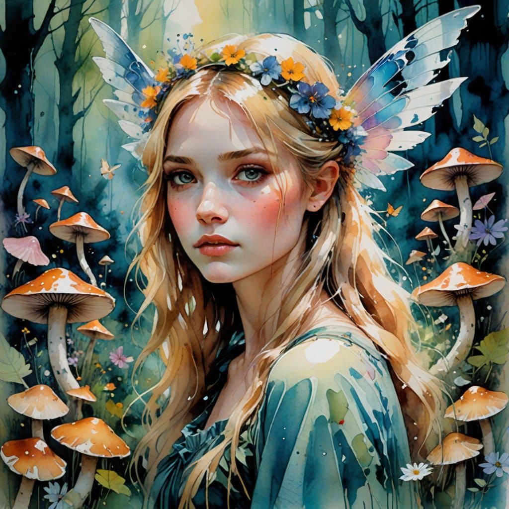 This image shows a beautiful fairy with blonde hair and iridescent wings in an enchanted forest. Magical mushrooms glow with inner light in a watercolor style. Soft, warm light shines down.