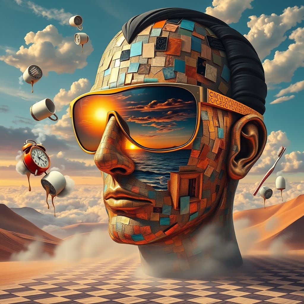 This AI-generated image depicts a giant mosaic and metallic head sculpture in a dreamlike landscape. It features a sunrise reflection in its sunglasses, surrounded by melting clocks and surreal breakfast items.