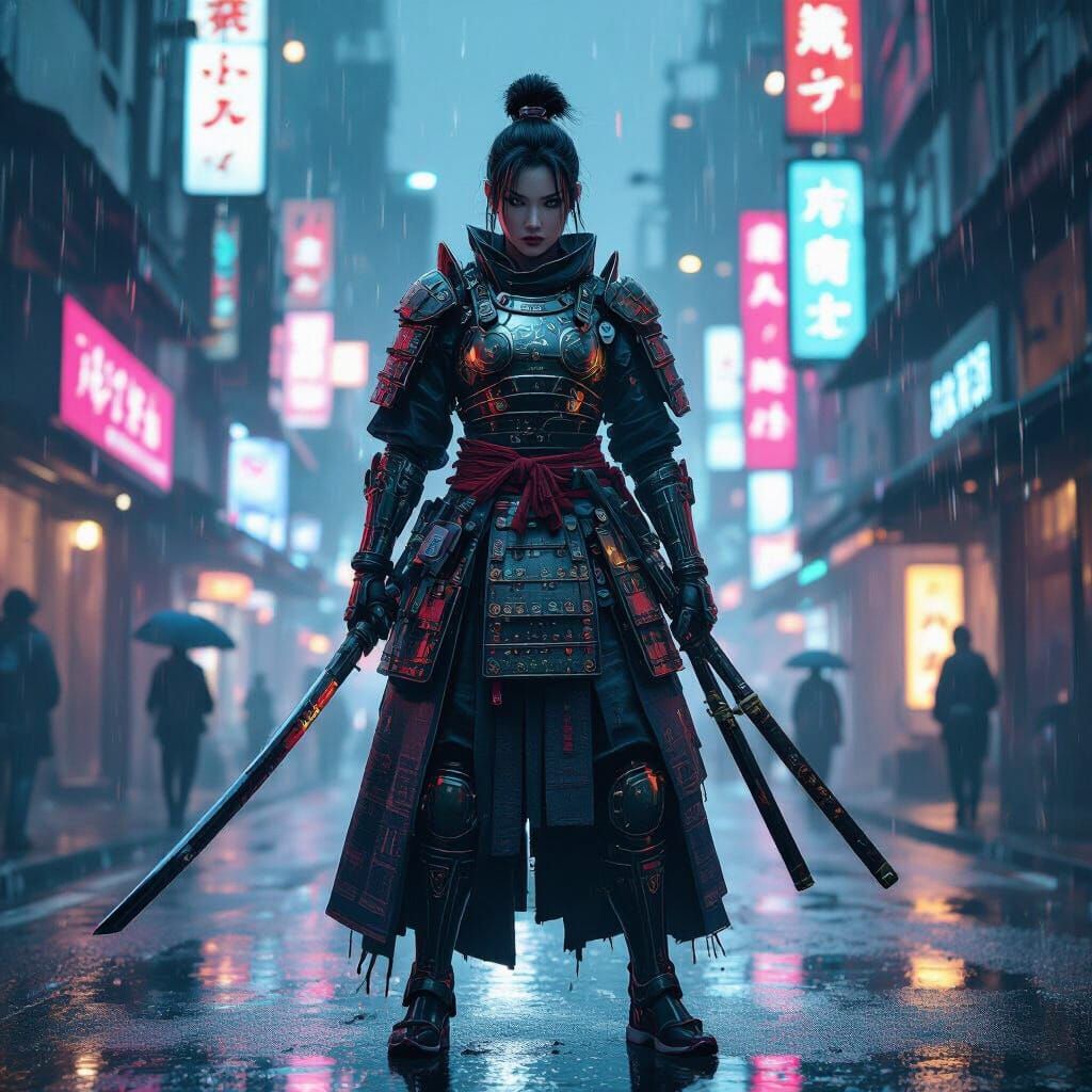 A hyperrealistic concept art piece depicting a fierce female samurai in ornate armor on a wet, neon street. Dynamic lighting and cybernetic details evoke a futuristic metropolis.