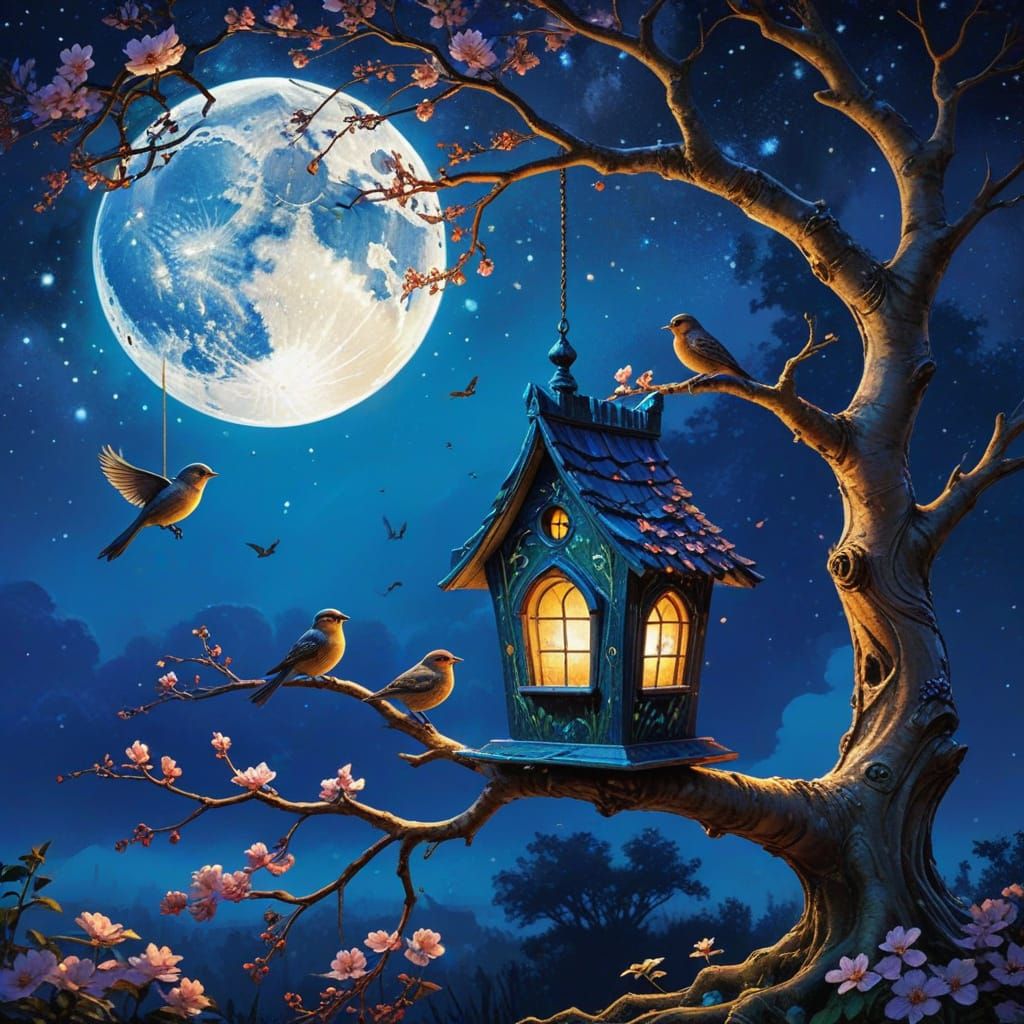 A watercolor painting of a dreamlike birdhouse hanging from a tree branch, surrounded by birds. The scene is bathed in moonlight, creating magical shadows, with rich textures in a vintage art style.