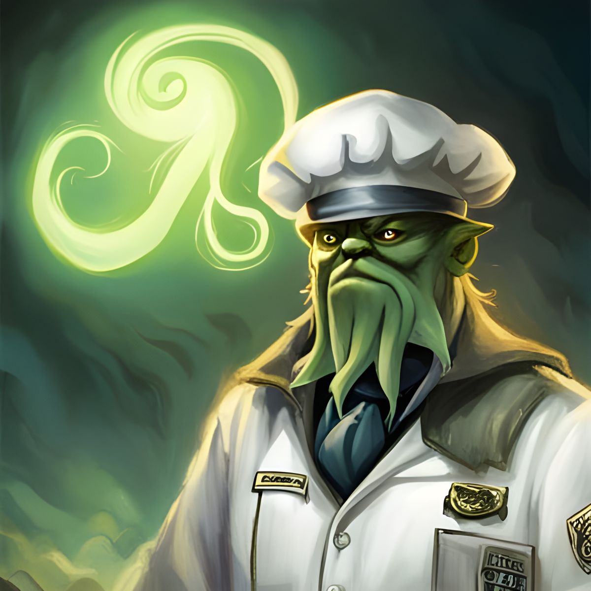 This image shows chefs inside Cthulhu, creating an unsettling and surreal scene. The artwork blends culinary elements with Lovecraftian horror.