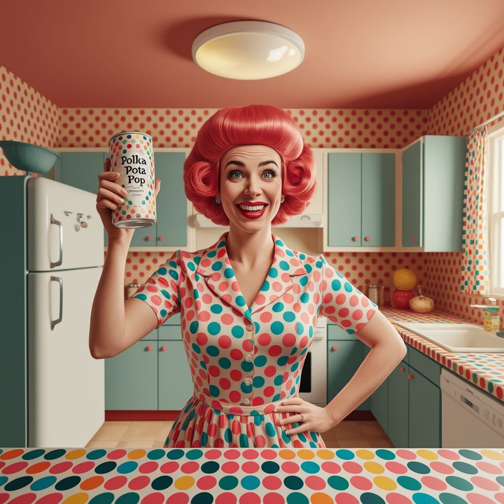 This image shows a smiling housewife in a polka dot dress holding a can of polka dot themed pop. The setting is a vintage mid-century modern kitchen with matching decor, bathed in warm studio lighting.