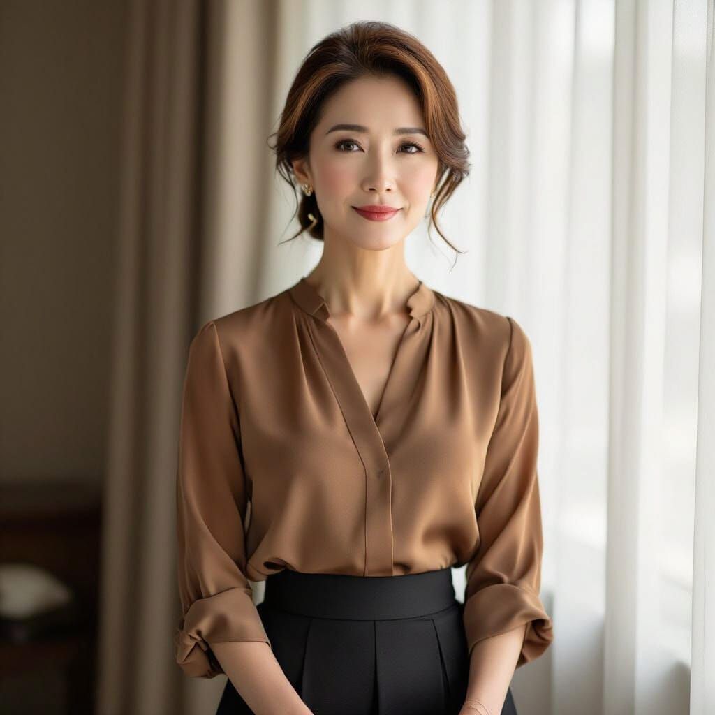 This image shows a beautiful mature Japanese woman exuding elegance and grace. She is wearing a sophisticated outfit and soft makeup, captured with cinematic lighting in a realistic photographic style.