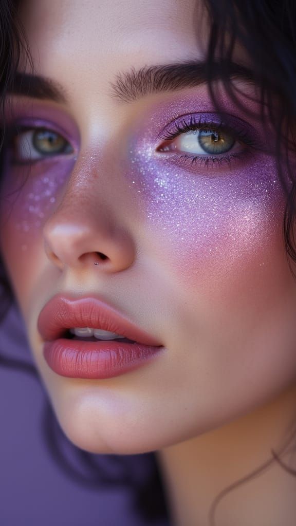 This portrait of a young woman features luminous skin and a soft, velvety purple blush, evoking the dreamy quality of 19th-century Romanticism and digital art