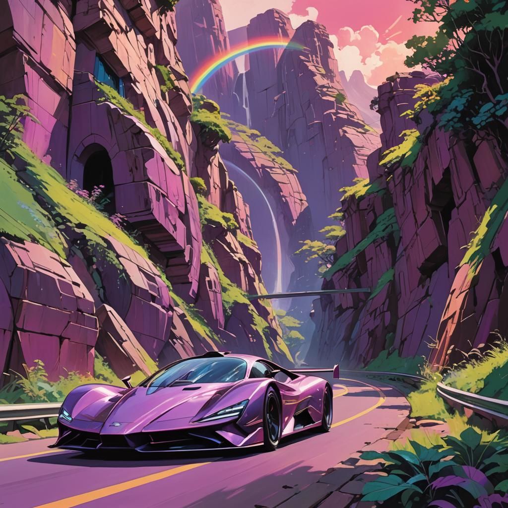 A figure in a racing car speeds down a track surrounded by nature. The artwork features vibrant rainbows and solar flares in a futuristic aesthetic.