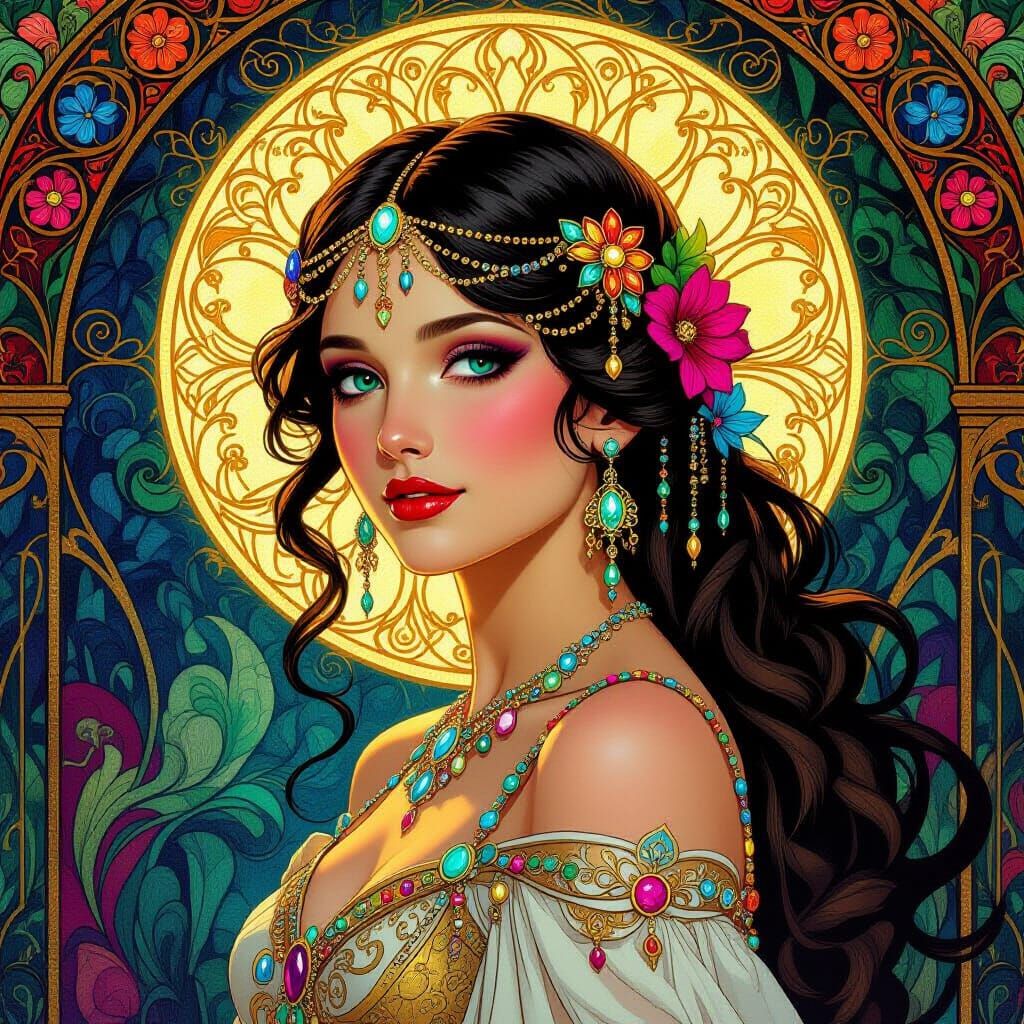 A beautiful woman is adorned with vibrant, detailed ornaments against a rich, abstract background. This fantasy art piece features maximalist detail, glowing highlights, and dramatic backlighting, evoking a jewel-toned aesthetic.