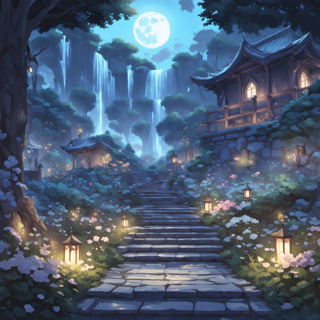 This digital painting depicts a serene Japanese garden at night, featuring a waterfall and luminescent flowers under a starry sky. Soft moonlight illuminates pathways, with starlight reflecting on wet petals.