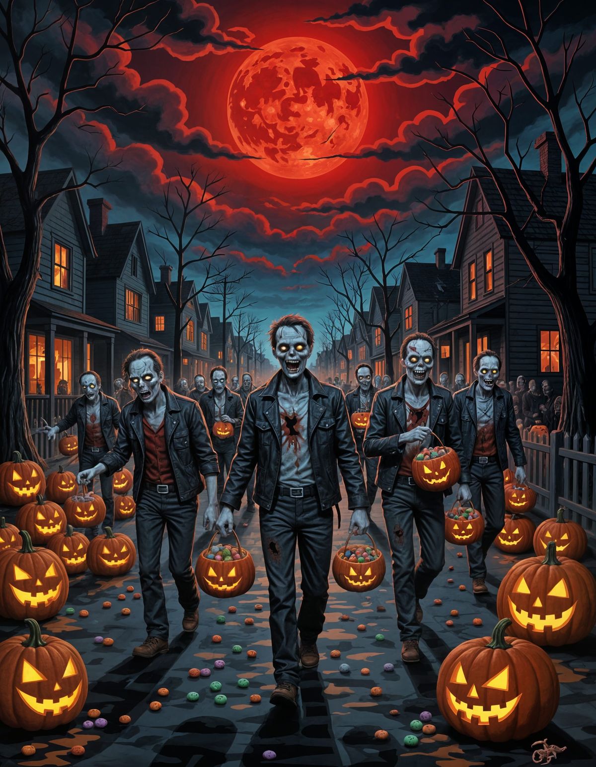 An unholy group of zombies, their faces frozen in grotesque, happy expressions, stumble across an abandoned town bathed in red moonlight. Each carries a small pumpkin-shaped candy pail, collecting sweets from shattered doorsteps and broken candy bowls. Their decaying hands tremble with excitement as they go door to door, craving not brains—but candy. Jack-o-jill lanterns flicker with wicked smiles along the pathways, illuminating the undead horde’s eerie march. The streets are lined with ghostly Halloween decorations, fluttering in the chill autumn breeze, as shadows crawl across cracked pavement.