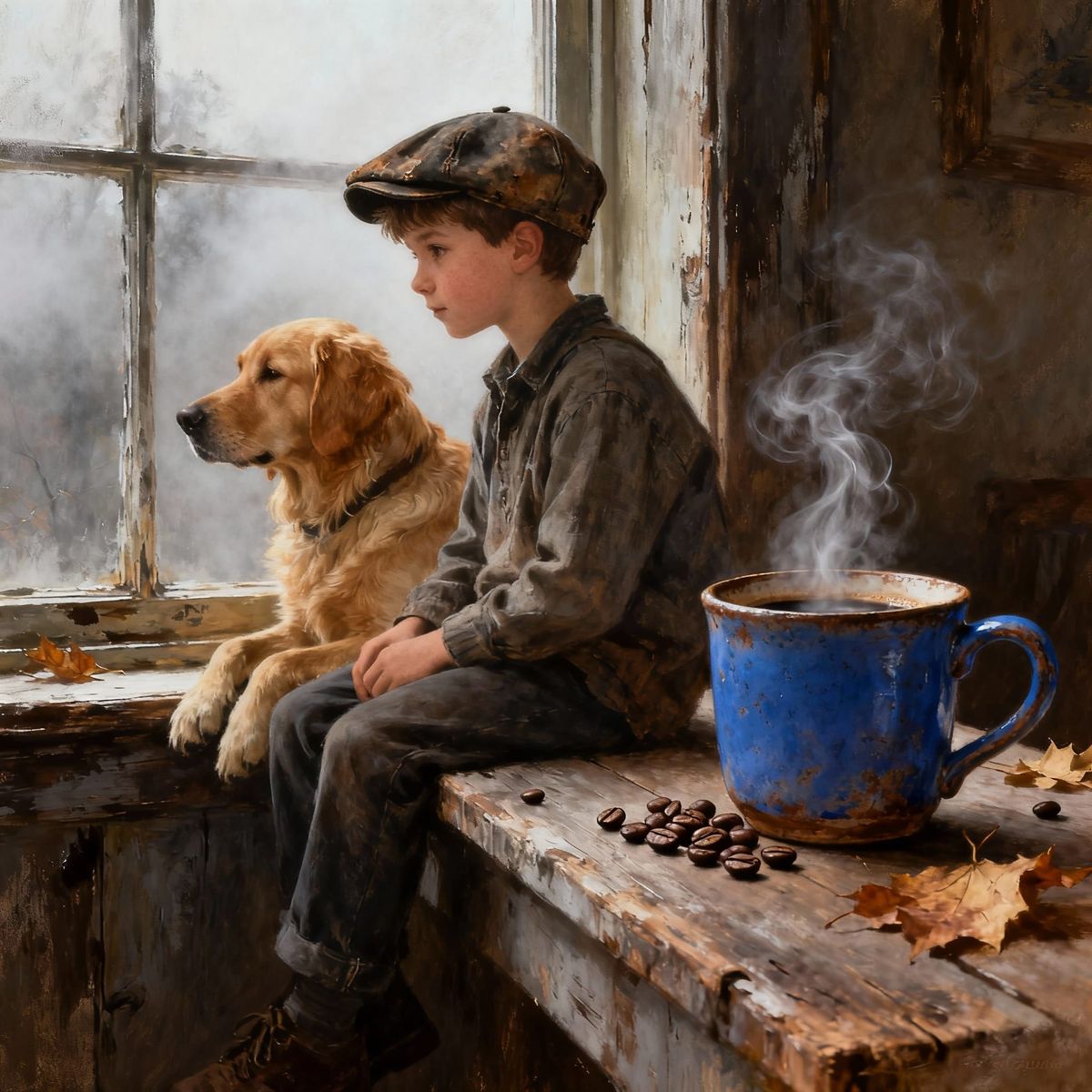 This image shows a hyper-realistic painting of a boy and his golden retriever on a windowsill with coffee and autumn leaves. It features soft light and a cozy, nostalgic mood.