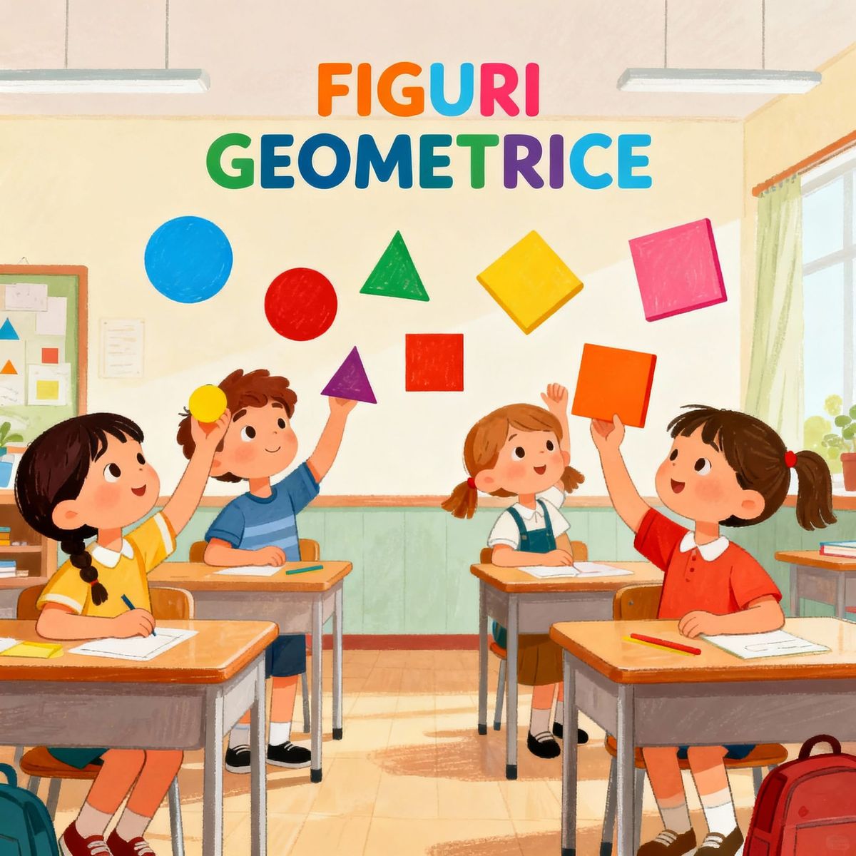 This image shows young students engaging with floating geometric shapes in a vibrant, cartoon-style classroom. Designed to be friendly and educational, it resembles illustrations from children's books.