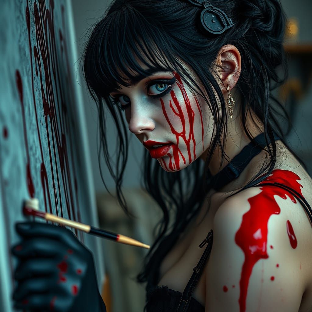 This image shows a gothic woman in her studio, painting a canvas with a blood-stained brush. The scene is captured in high detail, with a mix of light and dark elements, creating a moody and atmospheric atmosphere.