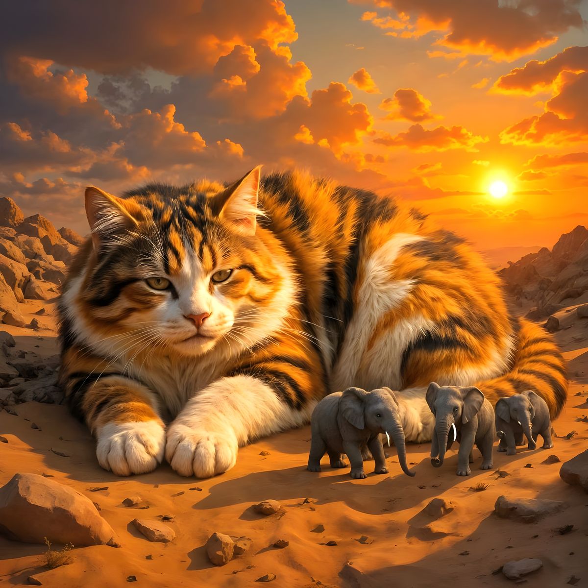 A striking picture of a large, fluffy calico cat sleeping near tiny elephants. The warm sunset creates dramatic shadows, with intricate details and expressive textures in a maximalist realism style.