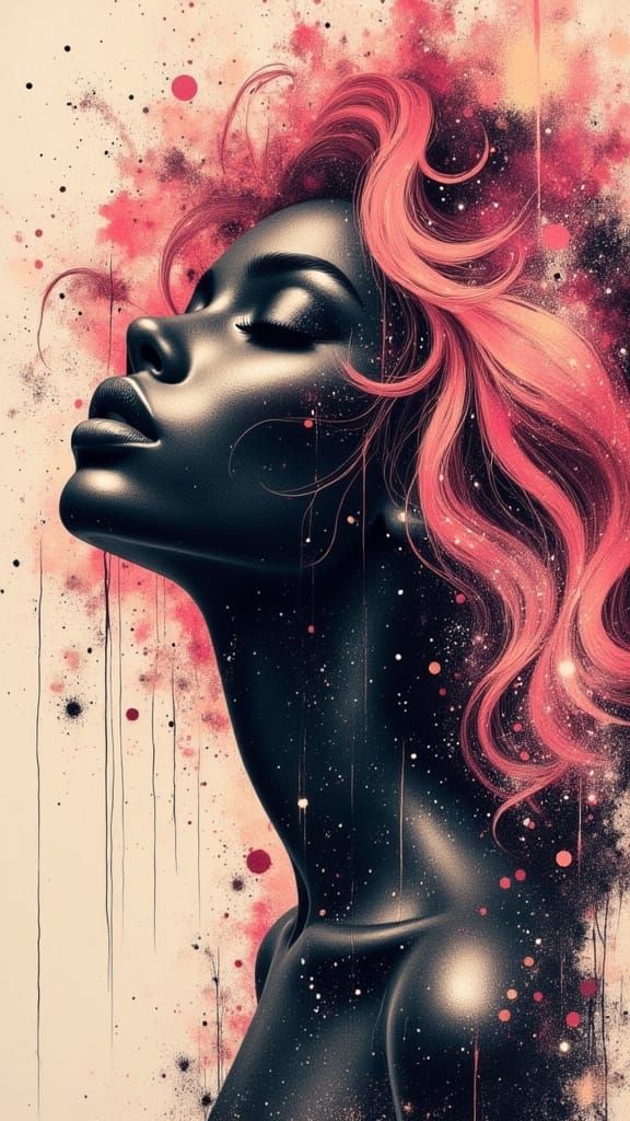 This image shows a beautiful African woman with flowing pink hair, blending gothic, romantic, and surreal elements in a vibrant digital painting.