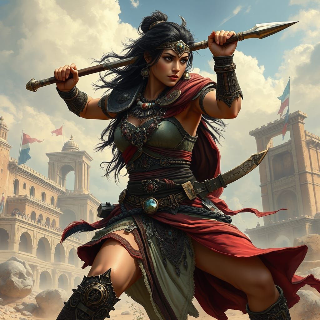 A striking picture of a powerful female warrior in a battle stance. She wears ancient clothing and jewelry, holding weapons, set against a ruined city with neutral colors, as cinematic art.