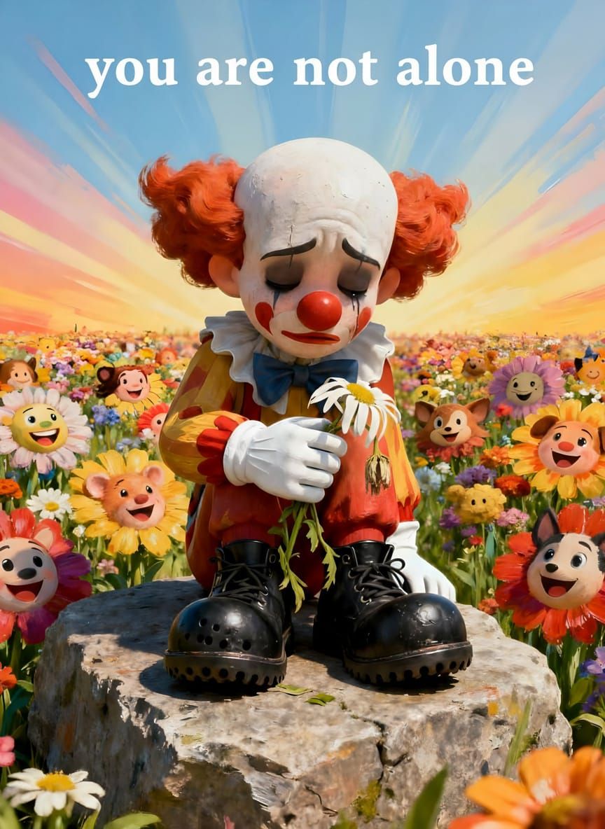 This image shows a sad clown, painted with thick acrylic textures, ignoring a vibrant field filled with joyful faces. Rendered in a 3D digital art style with bright colors.