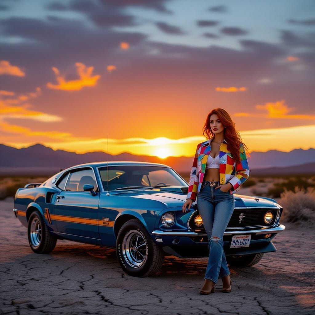 This image captures a stunning scene of a woman in a patchwork jacket beside a metallic blue 1969 Mustang Boss 429 in a desert at sunset. Photorealistic with cinematic lighting.