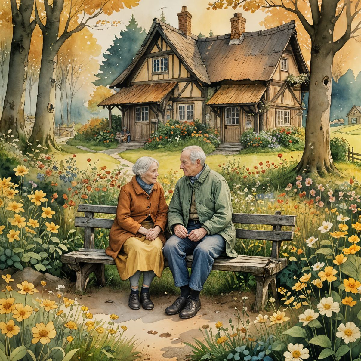 This image shows an elderly couple holding hands on a bench before a quaint cottage near a forest. Golden light and autumn flowers create a cosy, storybook illustration aesthetic.