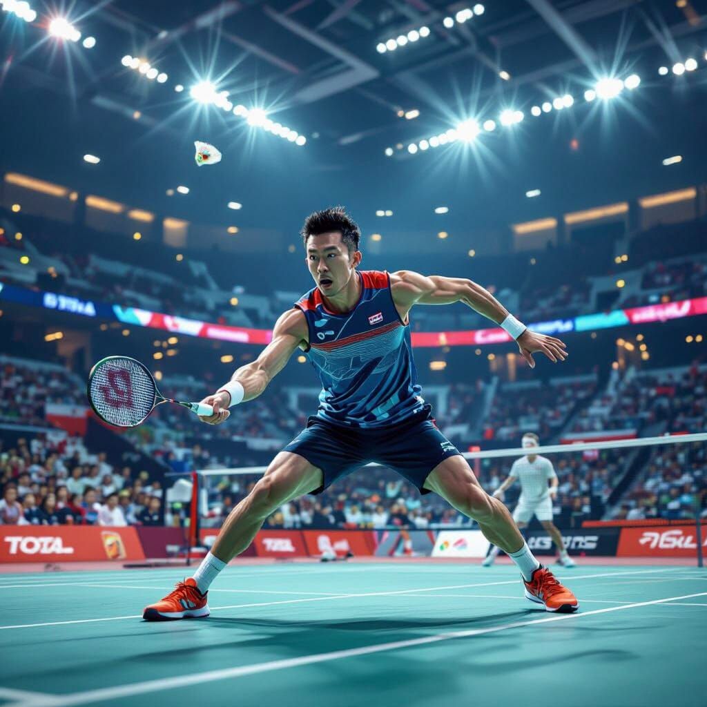 This image shows a badminton player in dynamic action on a modern court. The artwork features high contrast and vibrant lighting, with a sleek, futuristic aesthetic as 3D rendered digital art.