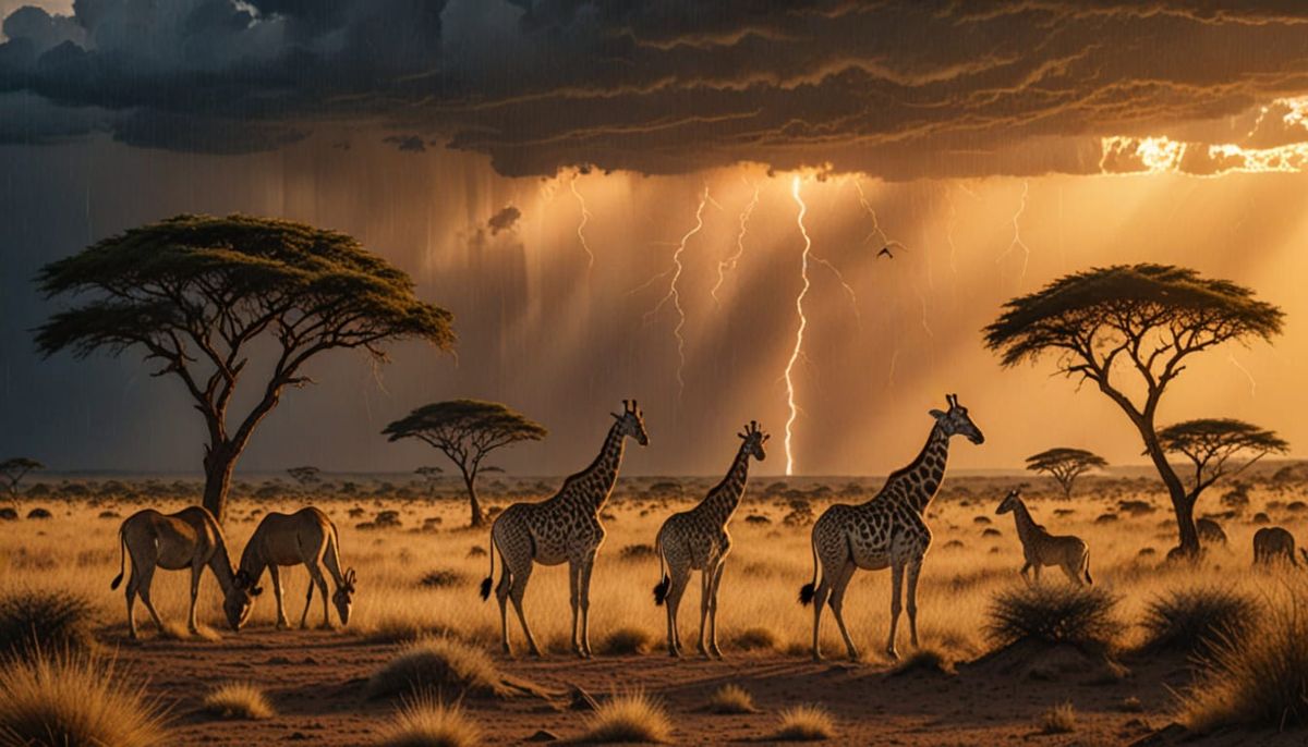 This image shows a lion stalking prey on the Serengeti as a thunderstorm rolls in. The scene is bathed in warm sunlight contrasting with the dark storm clouds in a photorealistic style.