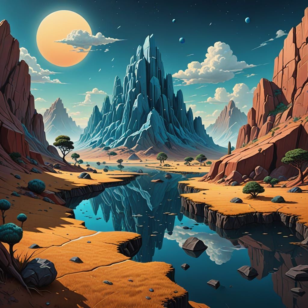 A surreal digital painting depicting three-dimensional objects seamlessly blending with flat, two-dimensional surfaces. Features strange juxtapositions and eerie lighting with vibrant color contrasts, evoking illusion and otherworldly scenes.