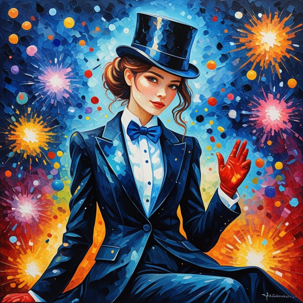 This image shows a devilishly dressed businesswoman made of colorful stars relaxing in a nebula. The artwork is a vibrant, hyperdetailed watercolor in a neo-impressionistic expressionist style.