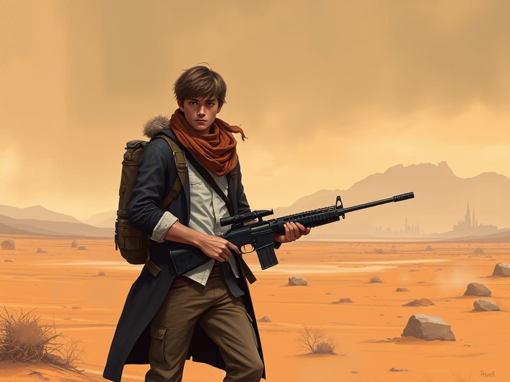 This image shows a young nomadic warrior standing in a desolate post-apocalyptic wasteland, surrounded by the ruins of a city and distant mountains. He wears a long coat and protective gear, and holds a rifle, in a gritty and realistic style reminiscent of No Man's Sky concept art.
