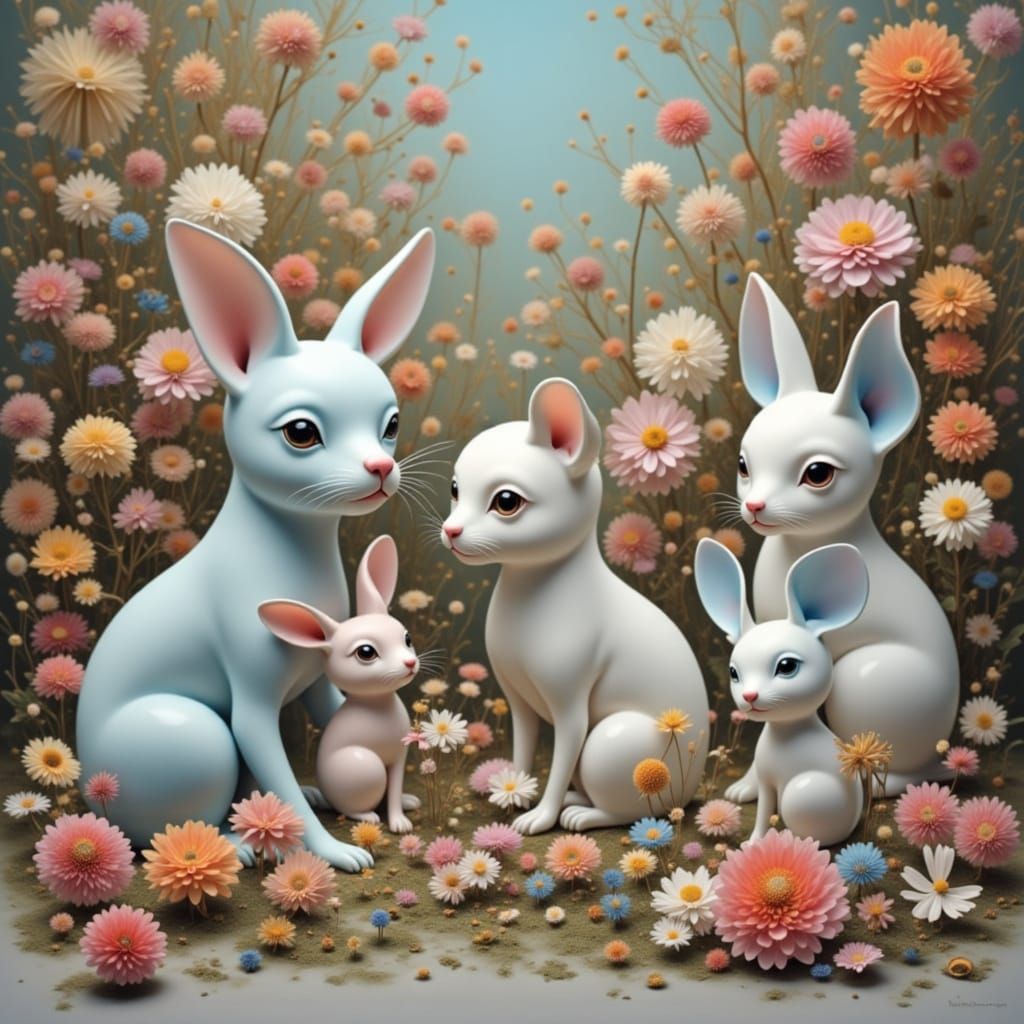 This image shows adorable porcelain animals like dogs, cats, and rabbits in a surreal, pastel-hued magical garden, evoking a sense of wondrous dreams.