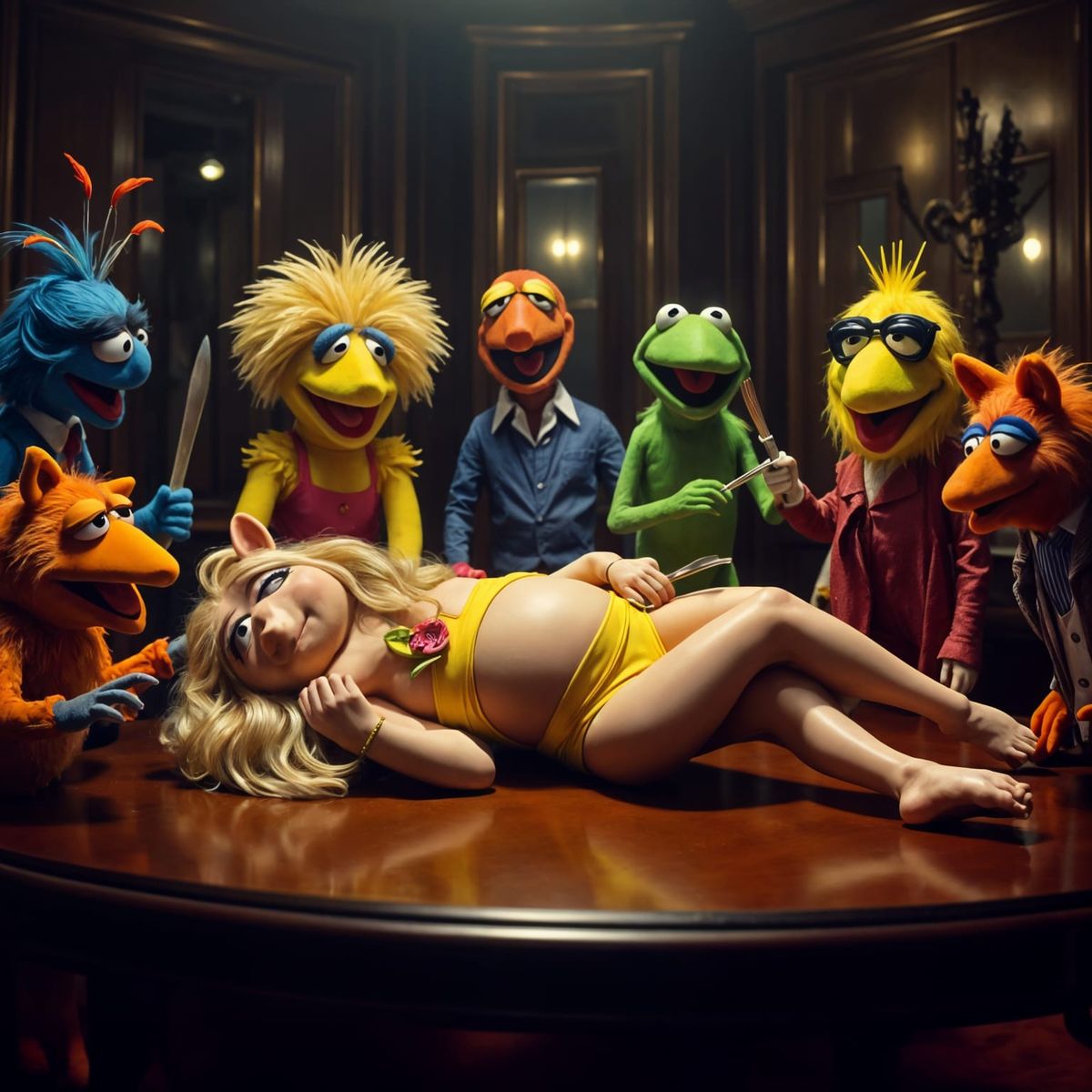 A cinematic film still depicts a surreal horror scene with Muppets standing around a sleeping Miss Piggy, captured in hyper-photorealistic detail with vibrant colors and atmospheric lighting