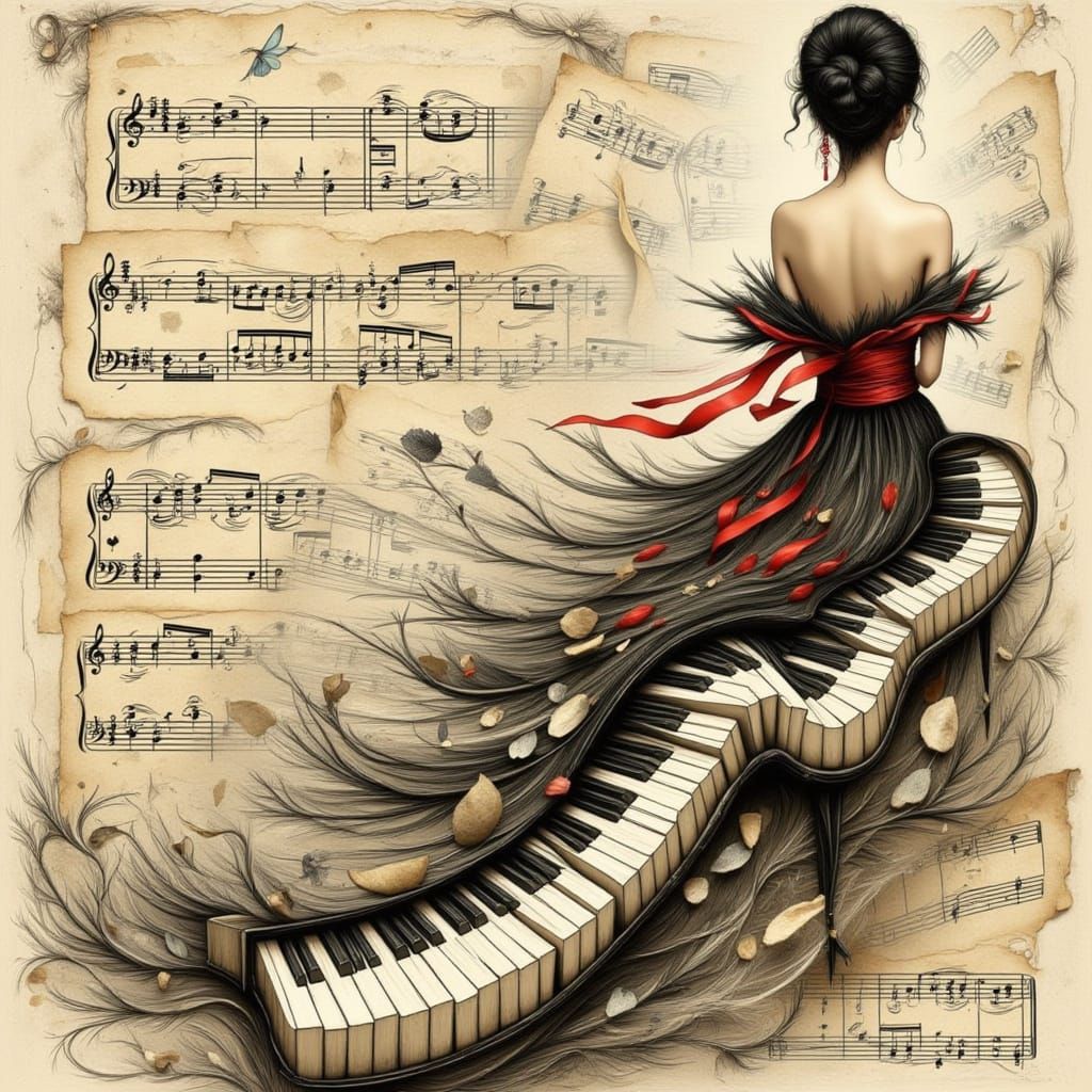 A surreal illustration of a woman from behind, her flowing dress becoming piano keys. Set against vintage sheet music, rendered in ink and watercolor with delicate sketch lines.