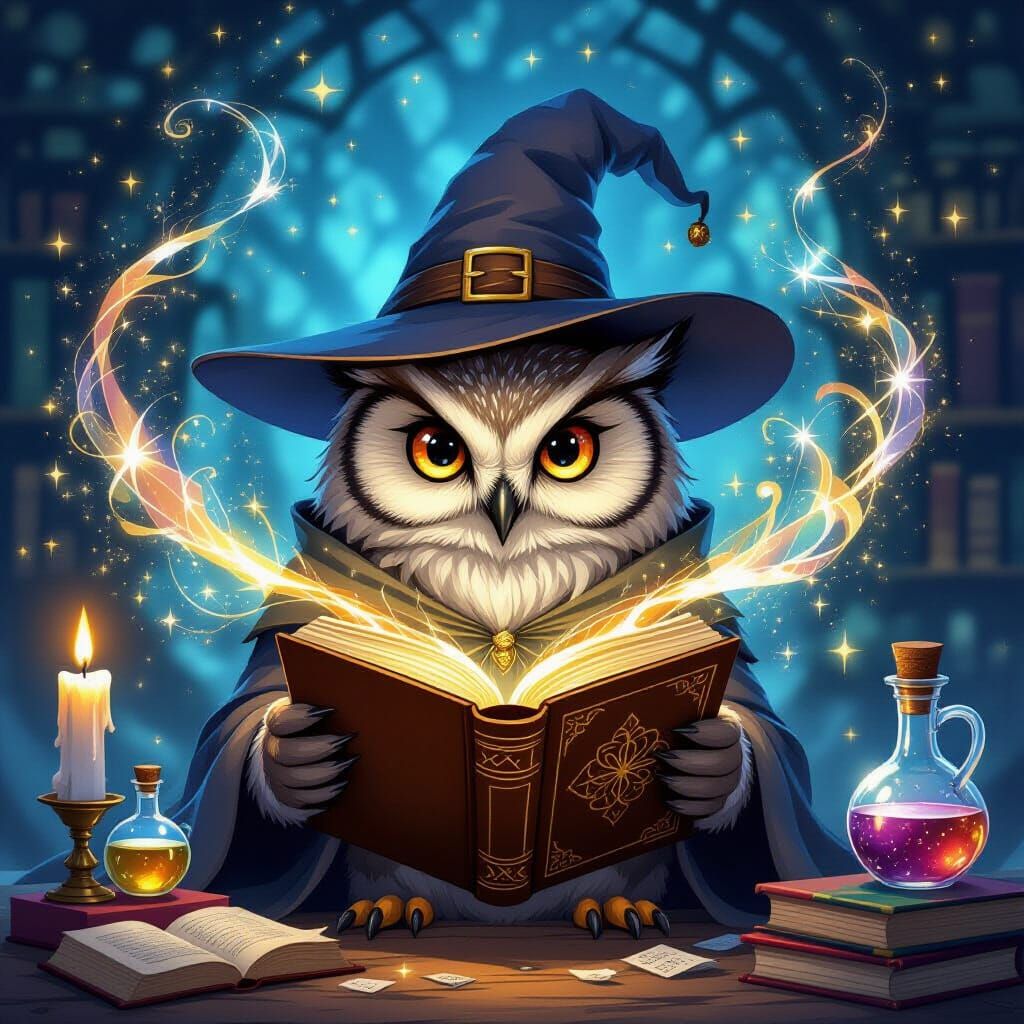 A captivating image of a regal owl with shimmering eyes, perched behind a book of spells. The whimsical scene is illuminated by candlelight, with magic swirling in the air as ribbons of light dance around books and flasks.