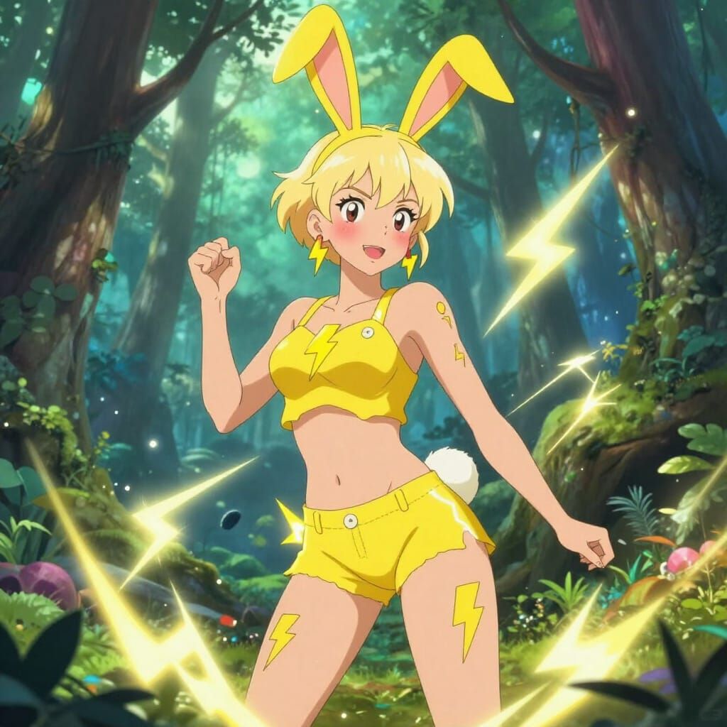 A petite, energetic yellow blonde wearing yellow sharp bunny years with rosy cheeks, wearing a skimpy yellow crop with a thunderbolt tag top and shorts with lightening accessories that show off her toned legs, she has lightning emblem tattoos with cute lightning-bolt earrings and a lightning shaped yellow ...