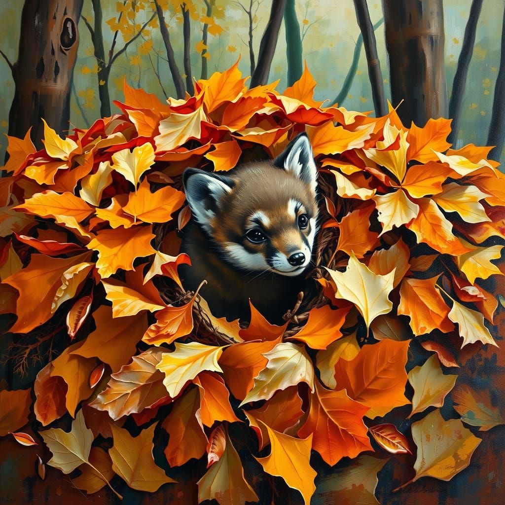 A charming impasto oil painting capturing a baby fox emerging from a vibrant pile of autumn leaves. The textured brushstrokes create a cozy, festive woodland scene.
