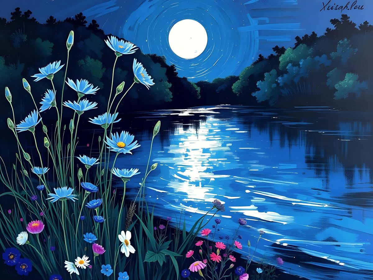 This serene night scene shows a field of vibrant blue cornflowers reflected in a calm river, with thick, heavy textures and bold brushstrokes evoking a dreamlike atmosphere, blending the ethereal with the organic in a modern, abstract impressionist style