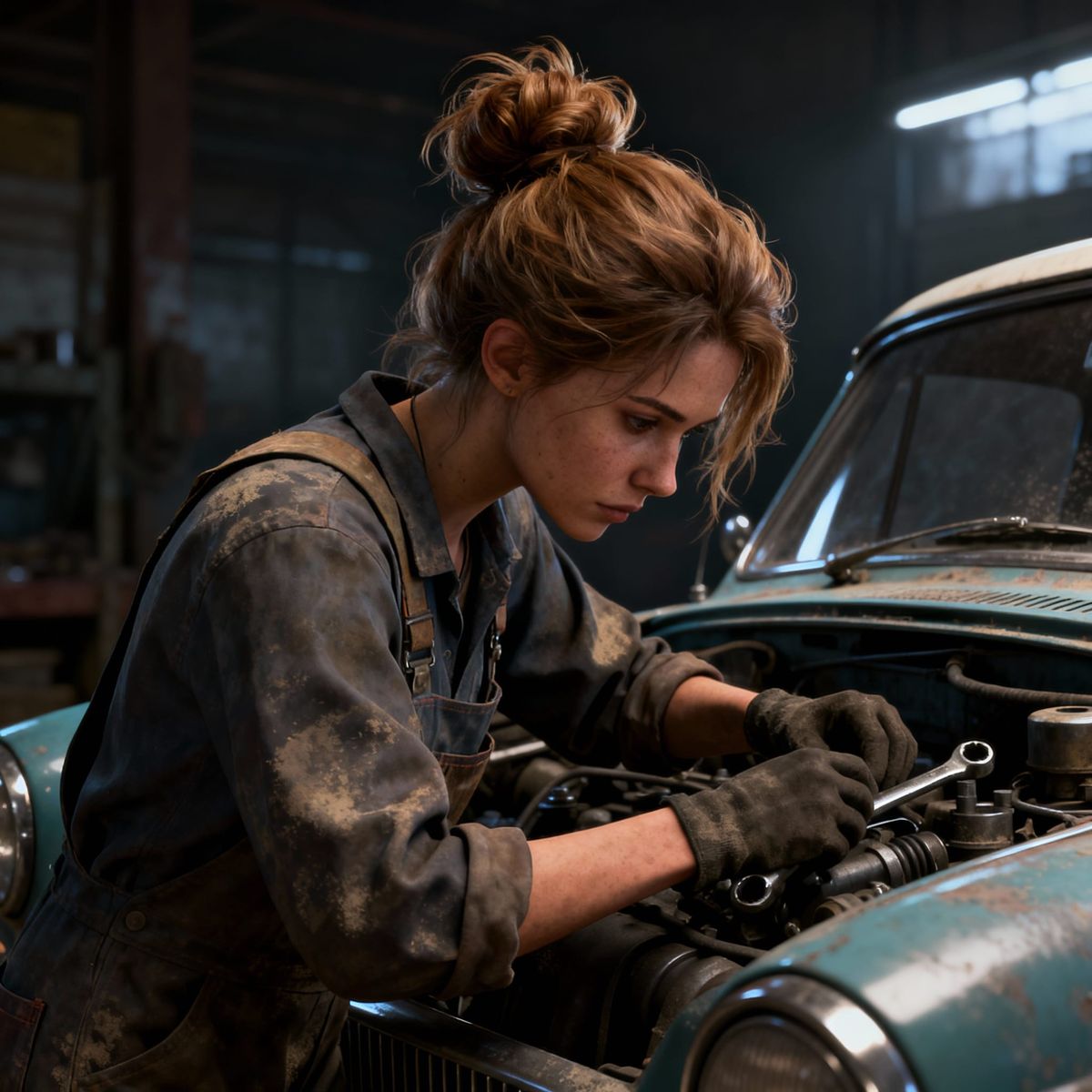 This image shows a female car mechanic with light brown hair in a messy bun, focused on repairing a vintage car. Rendered with deep colors and 3D shading, it captures realistic detail and dramatic lighting.
