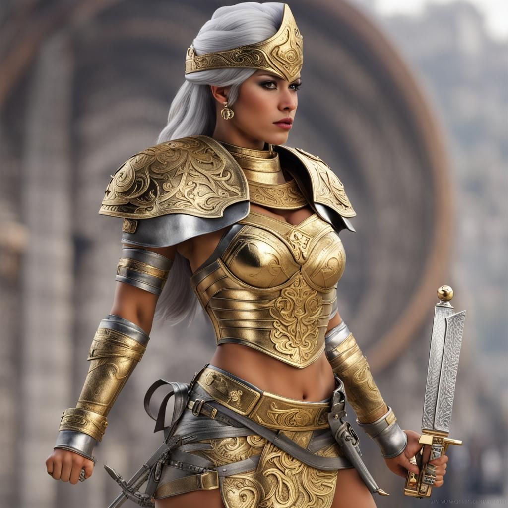 This image depicts a warrior woman in gleaming gold and silver armor. The high-resolution artwork showcases a powerful female figure.