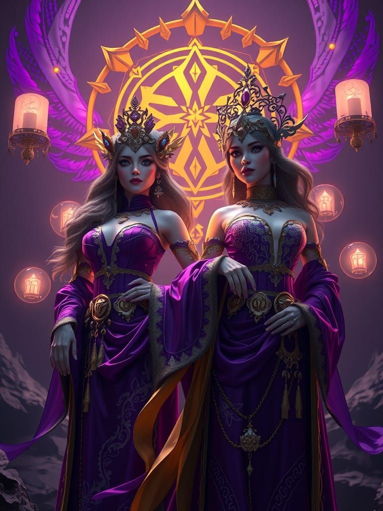 A digital painting of women in rich clothing celebrating a win in a magical world. The image features dramatic lighting, detailed textures, and ornate symbols, creating a dark fantasy aesthetic.