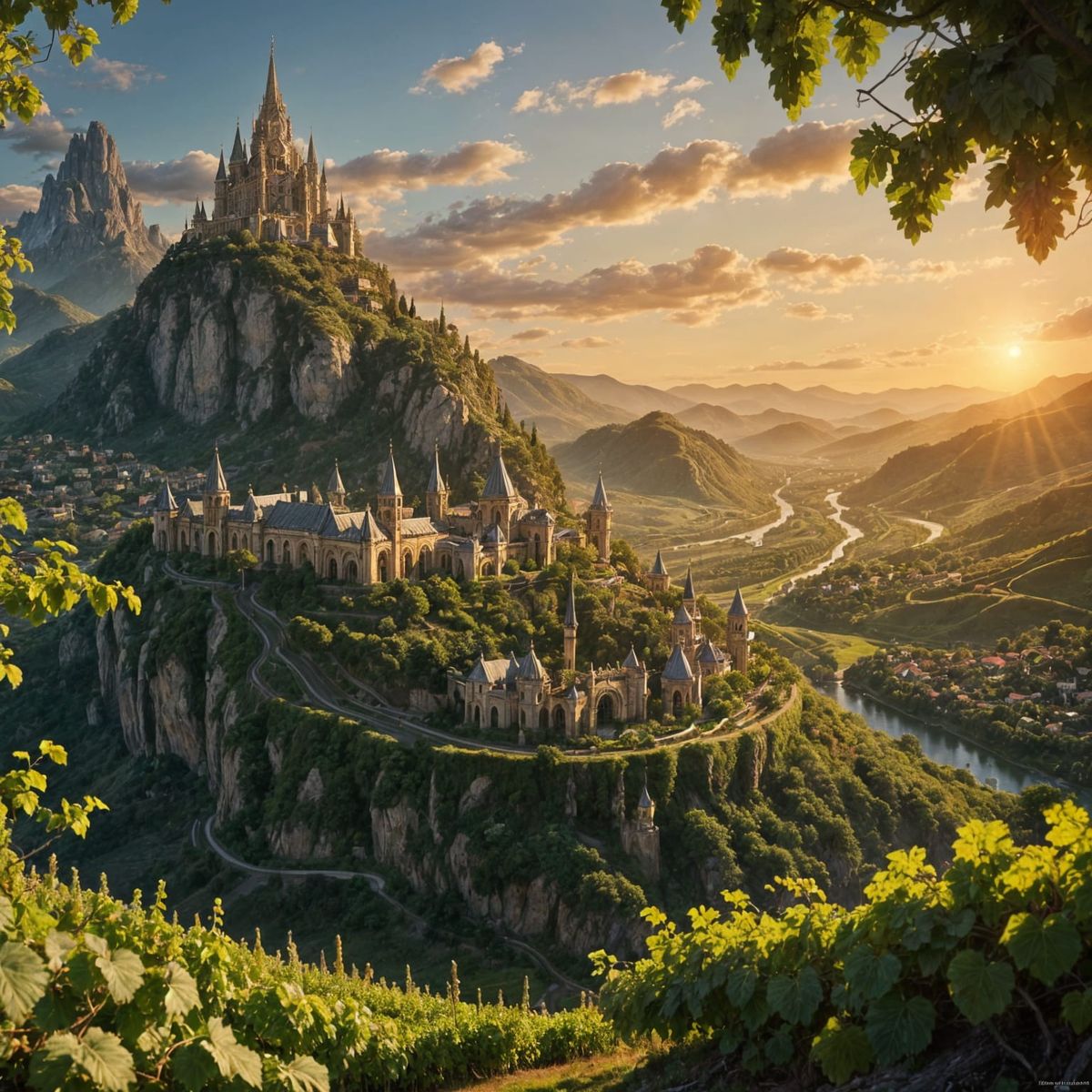 This image shows a breathtakingly detailed, high-fantasy elven city set amidst rolling hills of grapevines, bathed in the warm, golden light of sunset, rendered in vibrant, hyperrealistic colors.