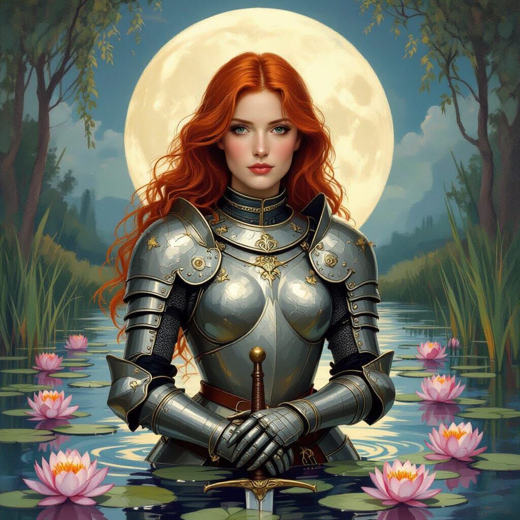 This striking image depicts a redheaded woman knight in detailed plate armor, set beside a tranquil water lily pond under a full moon. Rendered in a style reminiscent of pre-Raphaelite art, the piece features complementary colors and fine details.
