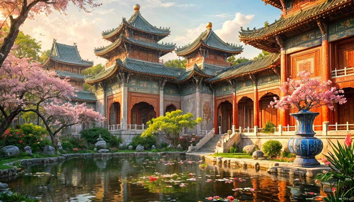 A hyperrealistic image of a Chinese palace surrounded by lush gardens. The artwork features soft colors and intricate details, rendered with dramatic lighting in 8K resolution.