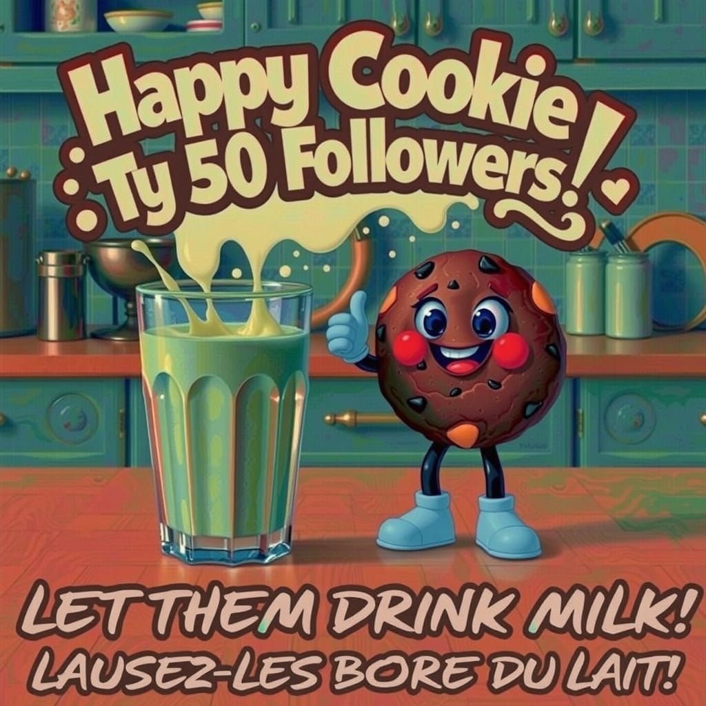 This image shows a glass of milk on a table in a cozy kitchen. Milk splashes spell out celebratory messages with cookies and chocolate. A cookie character gives a thumbs-up in this digital art.