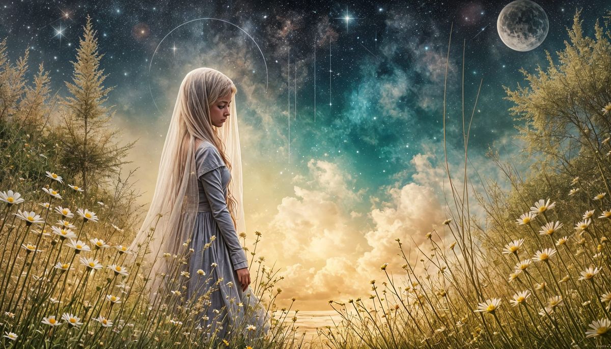 This surreal image captures a moment of longing and nostalgia, set against a backdrop of blooming marguerites and a starry spring evening sky.
