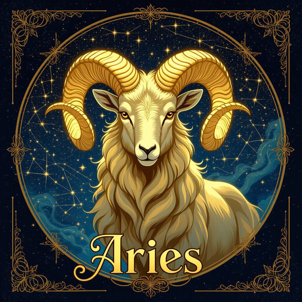 A celestial fantasy illustration showing a golden ram with glowing horns amidst constellations and stardust. The artwork evokes art nouveau and futuristic styles in a cosmic setting.