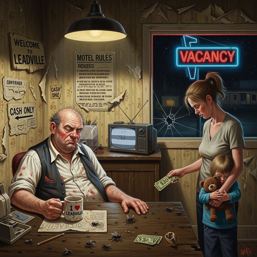 This oil painting captures a dimly lit, dusty motel lobby in Leadville, featuring a slumped manager and a weary traveler. The artwork uses a gritty realist style with atmospheric lighting.