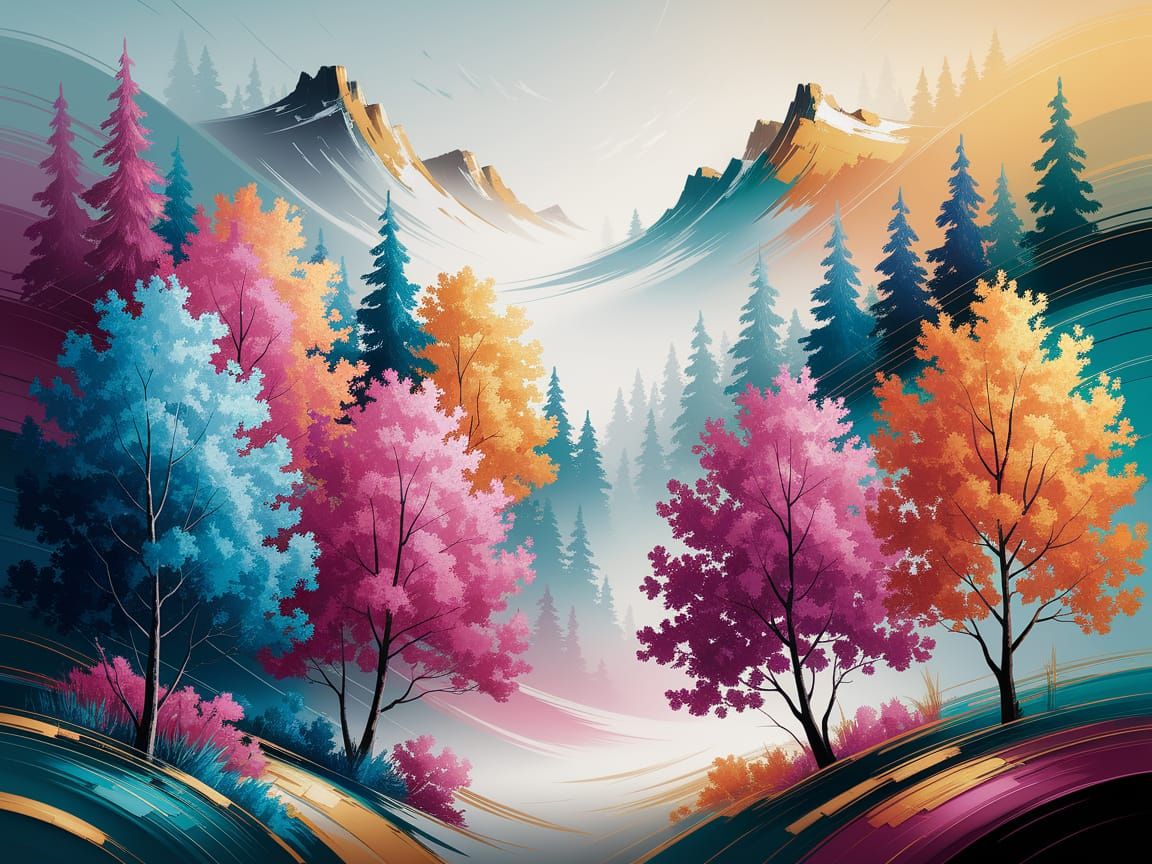 A vivid landscape with blue, pink, orange, and red trees. Softly blurred mountains form a backdrop, with ethereal teal and gold mist. This image captures an impressionist painting style.